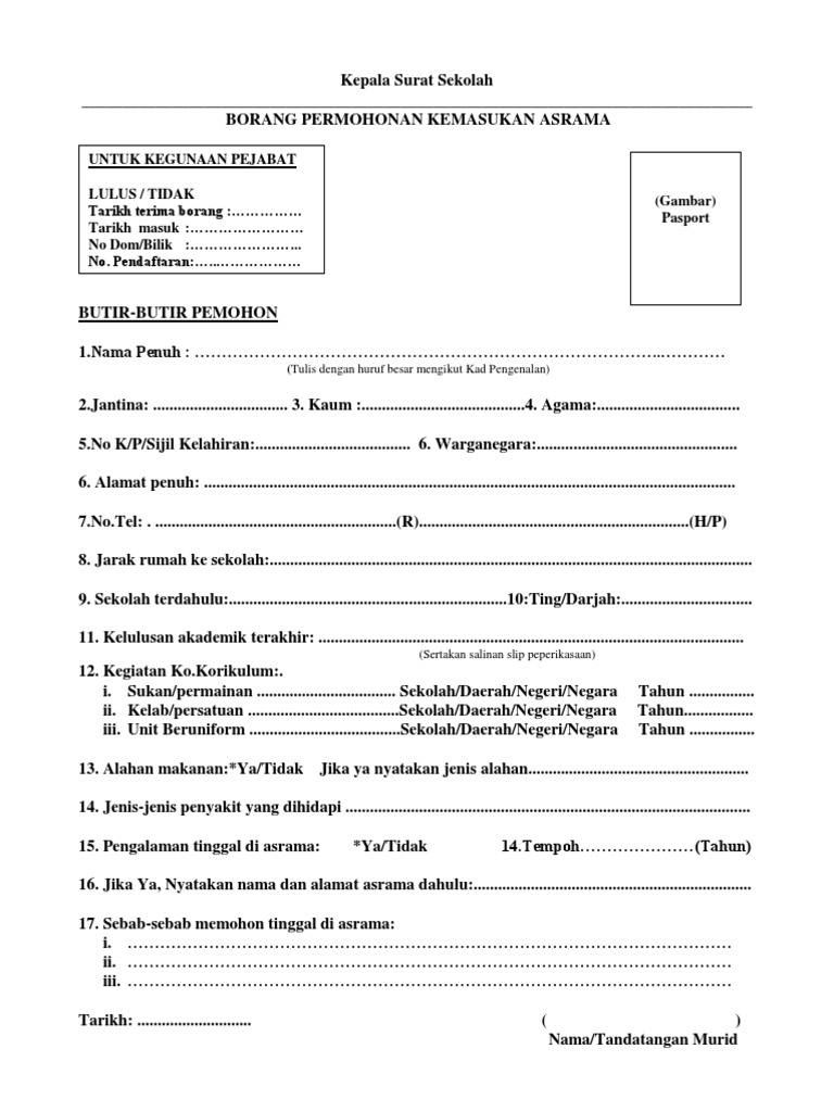 Contoh Borang Permohonan Masuk Asrama Pdf
