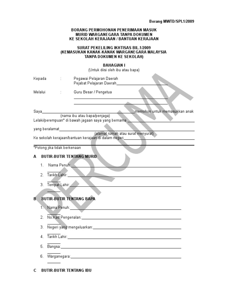 Contoh Borang Permohonan Penempatan Masuk Ke Tahun 1